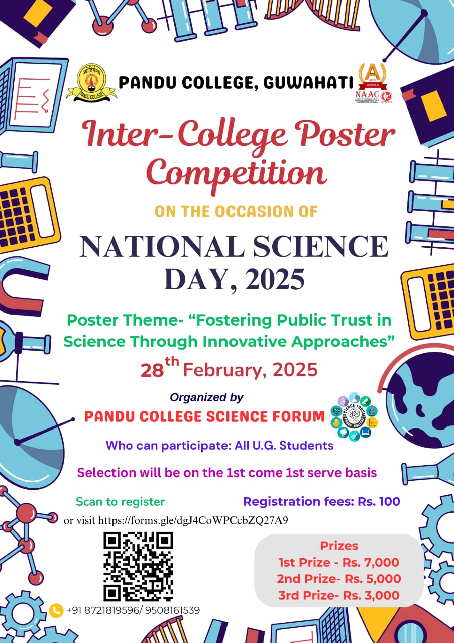 | 31 | Guidelines for Inter-College Poster Competition Pandu College Guidelines for Inter-College Poster Competition Pandu College, Guwahati * The theme for the poster is "Fostering Public Trust in Science Through Innovative Approaches". * Poster should be vertically oriented and the dimension should not exceed 3ft X 4ft. * Poster should include the Title of the poster, Name of the presenter, Class and name of the college. * One poster should be presented by not more than two students. * Participants should reach the college by 9.00 am with printed posters. * Participants should register themselves at the registration desk. * Poster should be hung at respective stands by 10.00 am. * Pins and other required stationary will be provided by the college. * All the participants are requested to submit a copy of the digital e-poster via Google form https://forms.gle/SPgMzhCWbjXA5U219 latest by 22nd February 2025. * The digital e-poster should be in JPEG/ PDF format with a maximum size of 10 MB. * One soft copy with a summary of the poster containing 200 words should be submitted at the time of the event. ** In view of the large number of registered participants, there will be a selection procedure by a screening committee to shortlist the final participants. For any further query contact- 8721819596/ 9508161539 |